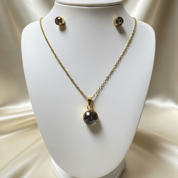 A classic jewelry set including a brilliant-cut crystal pendant necklace and matching stud earrings in gold settings.