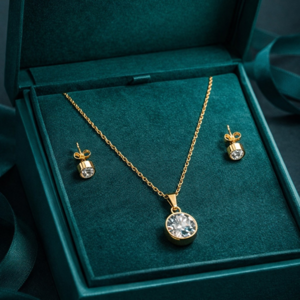 Housed in a plush emerald velvet box, this set defines classic sophistication. Both the necklace and the earrings feature a large, round-cut clear crystal held in a minimalist gold-tone bezel setting. The brilliant faceting of the stones ensures maximum sparkle, making it an ideal gift for special anniversaries or bridal wear.