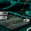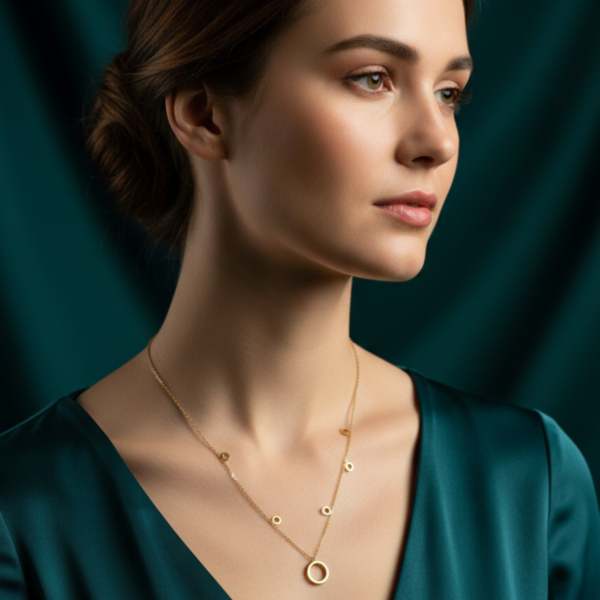 This ethereal station necklace features a series of polished gold-tone circles varying in size, spaced evenly along a fine link chain. The minimalist design allows it to catch the light subtly as you move. It is an ideal piece for layering with other necklaces or wearing alone for a refined, “barely-there” luxury aesthetic.