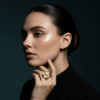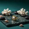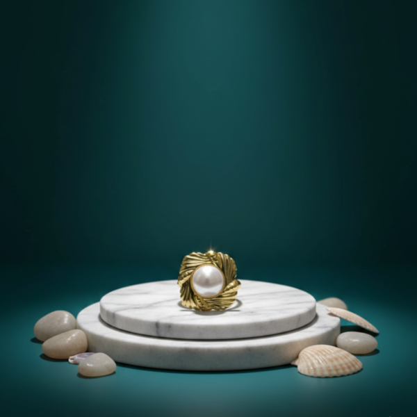 This statement ring evokes the beauty of the sea with its intricate, scalloped gold-tone metalwork that mimics the ridges of a shell. At its heart sits a luminous white pearl, creating a timeless look. Perfect for adding a touch of coastal elegance to any ensemble, it’s shown here against a luxurious backdrop of emerald marble and natural coral.