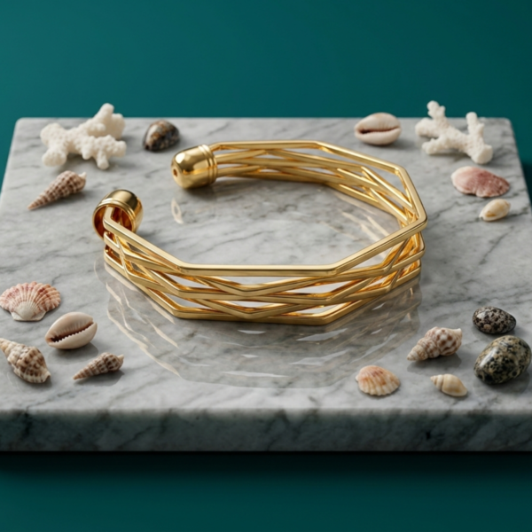 Engineering meets elegance in this multi-dimensional cuff. Constructed from several interlocking hexagonal gold-toned frames, the bracelet creates a beautiful lattice effect around the wrist. The open-work design allows for a lightweight feel despite its bold silhouette, finished with smooth spherical end-caps for a comfortable, slip-on fit. It is the ultimate accessory for those who love geometric jewelry.