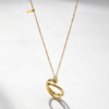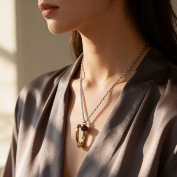 This necklace offers a fresh take on the infinity symbol. Suspended from a delicate gold-tone chain is a pendant consisting of two interlocking, thick gold hoops that spiral together. It’s a modern, symbolic piece that represents connection, finished with a small “LOVE” tag near the clasp for a personal touch.