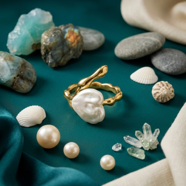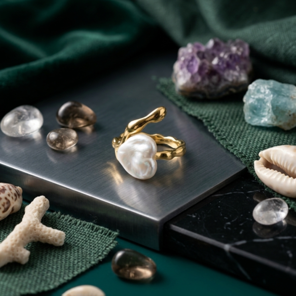 Modern romance meets organic texture in the Heart & Pearl Open Cuff Ring. This adjustable-style ring features an open bypass design, showcasing a sleek, brushed-gold heart on one end and a radiant, asymmetrical pearl on the other.