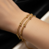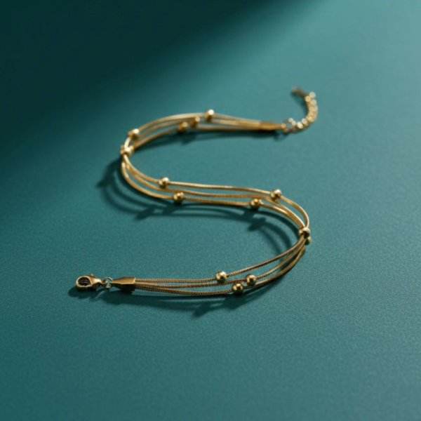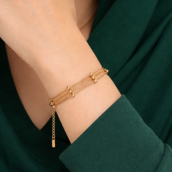 Jewelry Details: The bracelet is composed of three ultra-fine snake chains held together at the ends by sleek metal caps and a lobster claw clasp. Small, polished gold spheres are spaced along the chains, adding texture and a rhythmic visual interest.